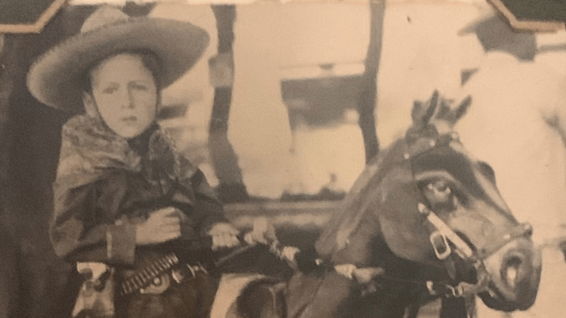 Mamá lo mandaba al mercado. Iba con canasta y pistola. Cargaba conmigo porque yo era su diversión. Cada vez que en esas andanzas pasábamos por una plazuela en la que había un fotógrafo de aquellos tiempos, me subía al caballo de cartón después de ponerme espuelas y chaparreras para fotografiarme. ¡Yo era feliz con aquel pelafustán!