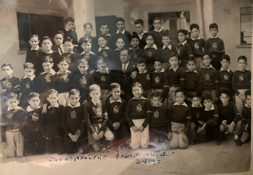 ¡Qué gratísima imagen percibí sorpresivamente! ¿Cómo era posible que existiera una escuela así? Alumnos tan aseados, bien vestidos y peinados. Todos uniformados y sentados en bellísimos pupitres con puerta horizontal para guardar, en la caja que ésta tapaba, sus hermosos libros y cuadernos. Con tintero y portaplumas. ¡Y el Profesor! con traje, chaleco, leontina dorada y corbata ocupando un bonito escritorio a cuyo respaldo clavado en la pared había un pizarrón ¡verde!